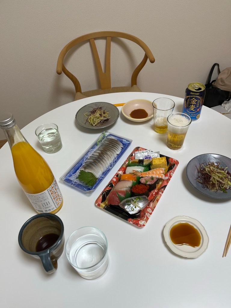 お寿司としめ鯖を食べて、ビールを飲んで,友人お手製のもやしときゅうりと海藻のサラダ,餃子,ニラ玉スープ,全部おいしかった!