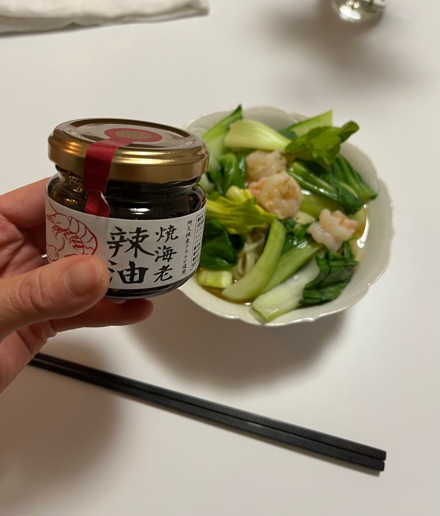 ちょうど夕飯は青梗菜と海老の伊府麺だったので,そこに海老辣油を入れた。