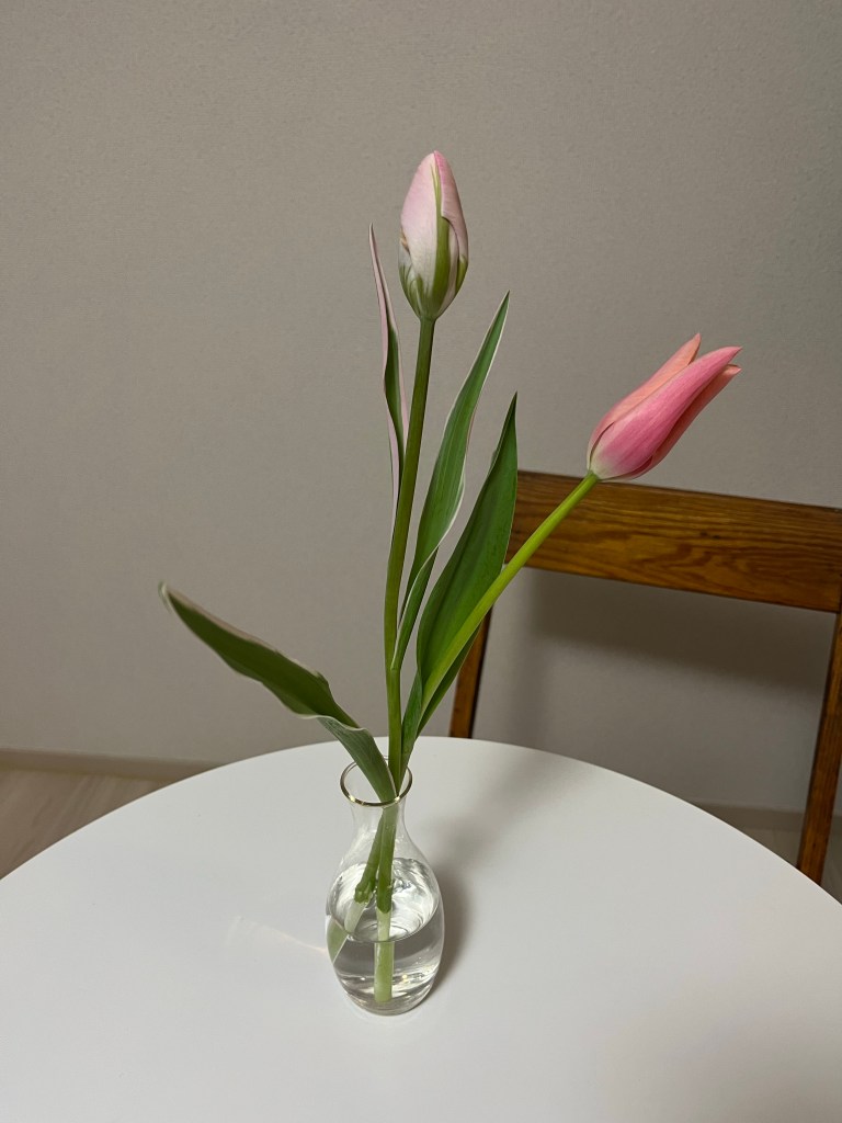 一駅先の駅で降りて商店街を歩いていたら,超かわいいチューリップを見つけて,迷わず買って,大寒波の風が強い中を高速スキップで帰る。