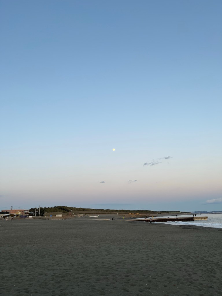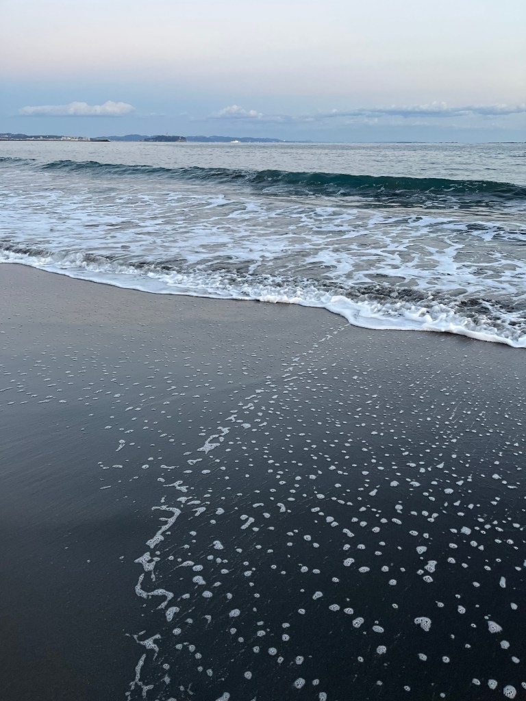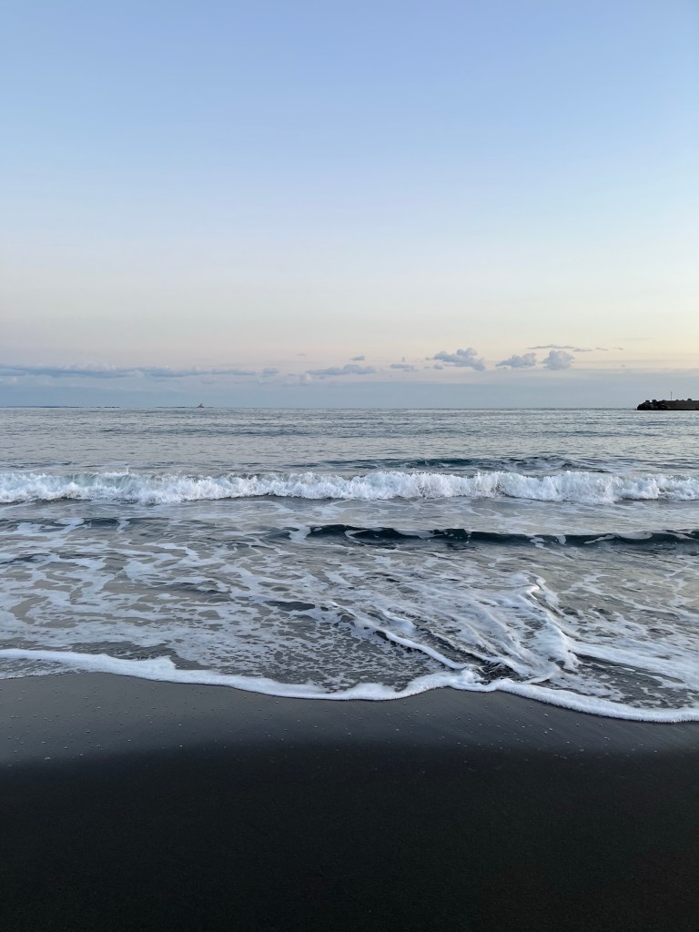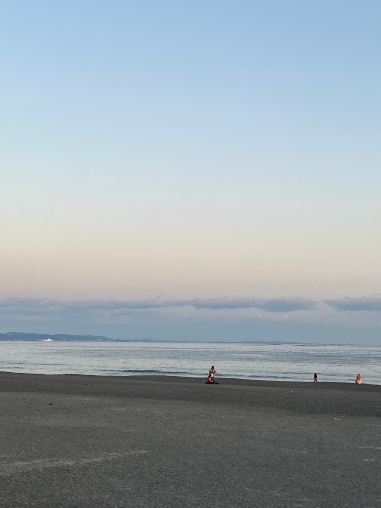 茅ヶ崎ね海は美しい海だった。砂浜は黒い。
