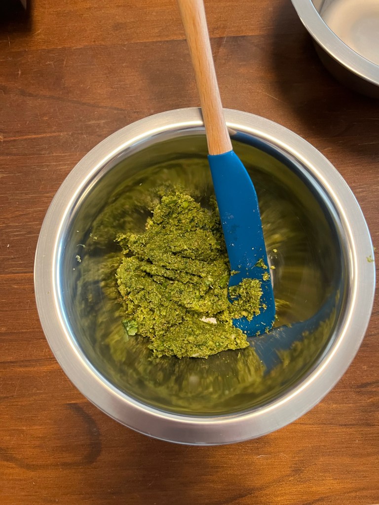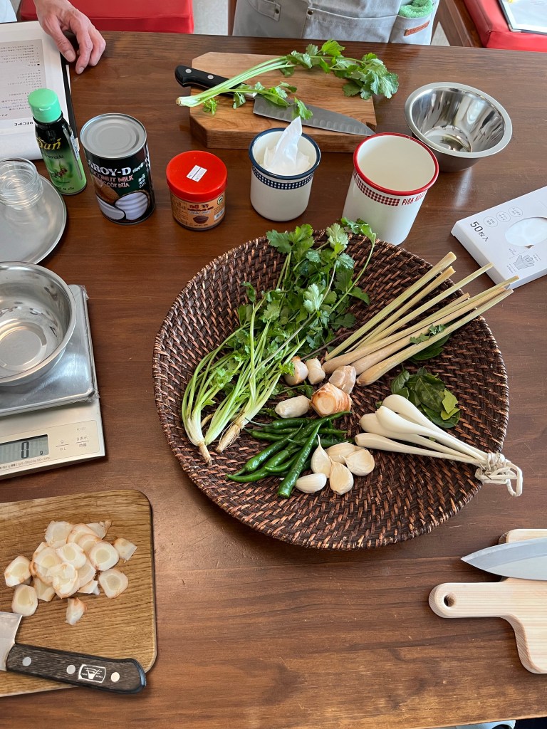 緑の野菜とレモングラス,タイの生姜(カー)こぶみかんの葉など珍しいものをどんどん刻んで細かくして,炒ったスパイスや塩と混ぜてペーストをつくる。