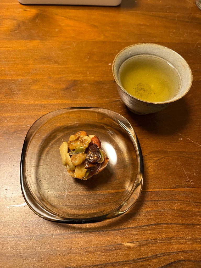 食後のデザートは先生の友人のお菓子屋さんがつくったキャラメルナッツのタルト,中には練ったさつまいもが入っている。うまい。