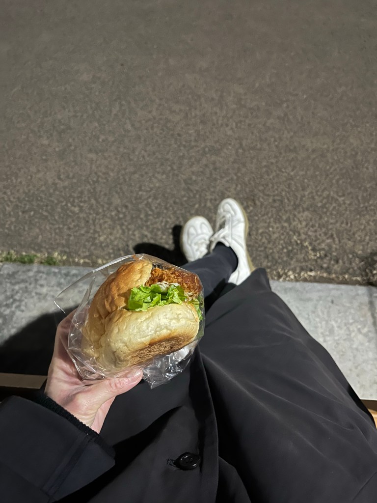 ふと我にかえり,そうだ外で食べてこって思ってベンチでフィッシュサンドをかじる。