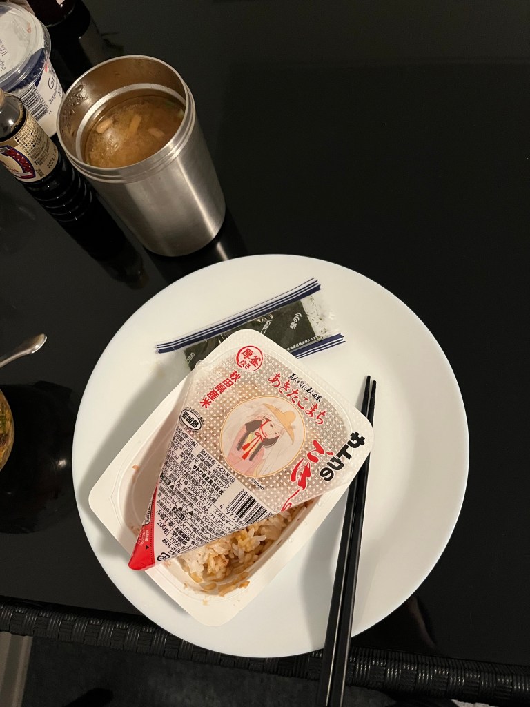 結局夕飯はサトウのごはんにかつお節と海苔と醤油(のり弁じゃん)あとお味噌汁でした。