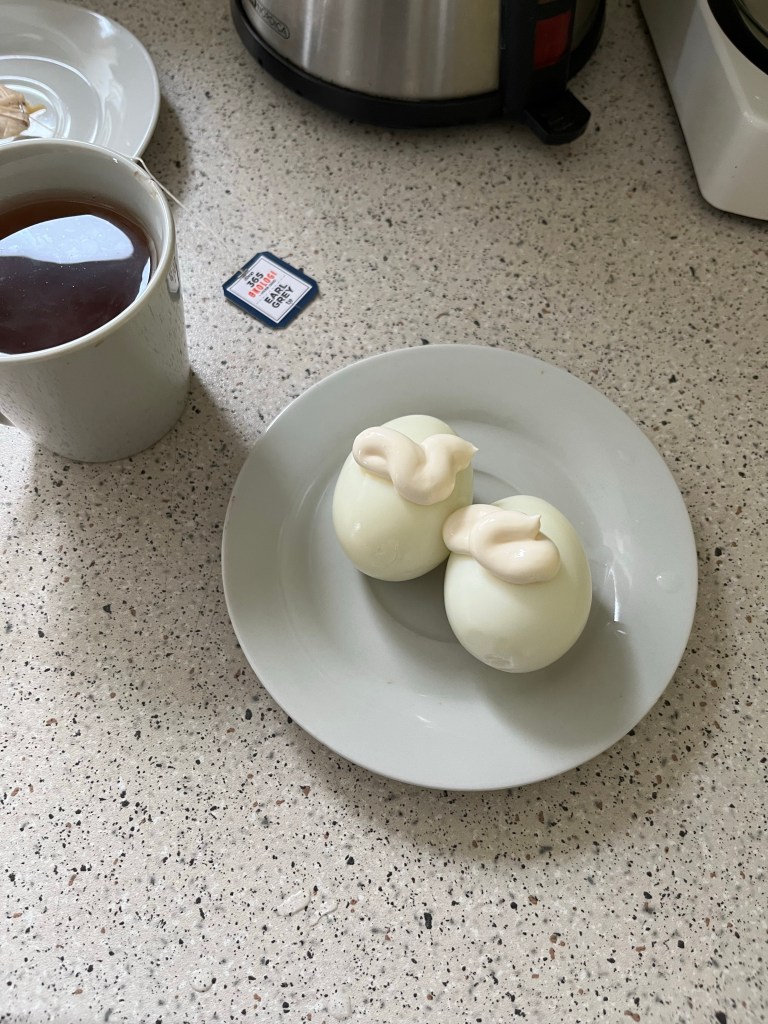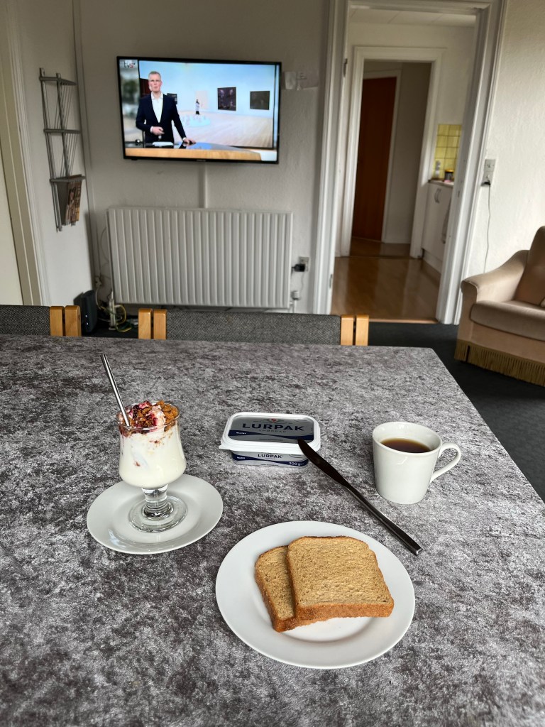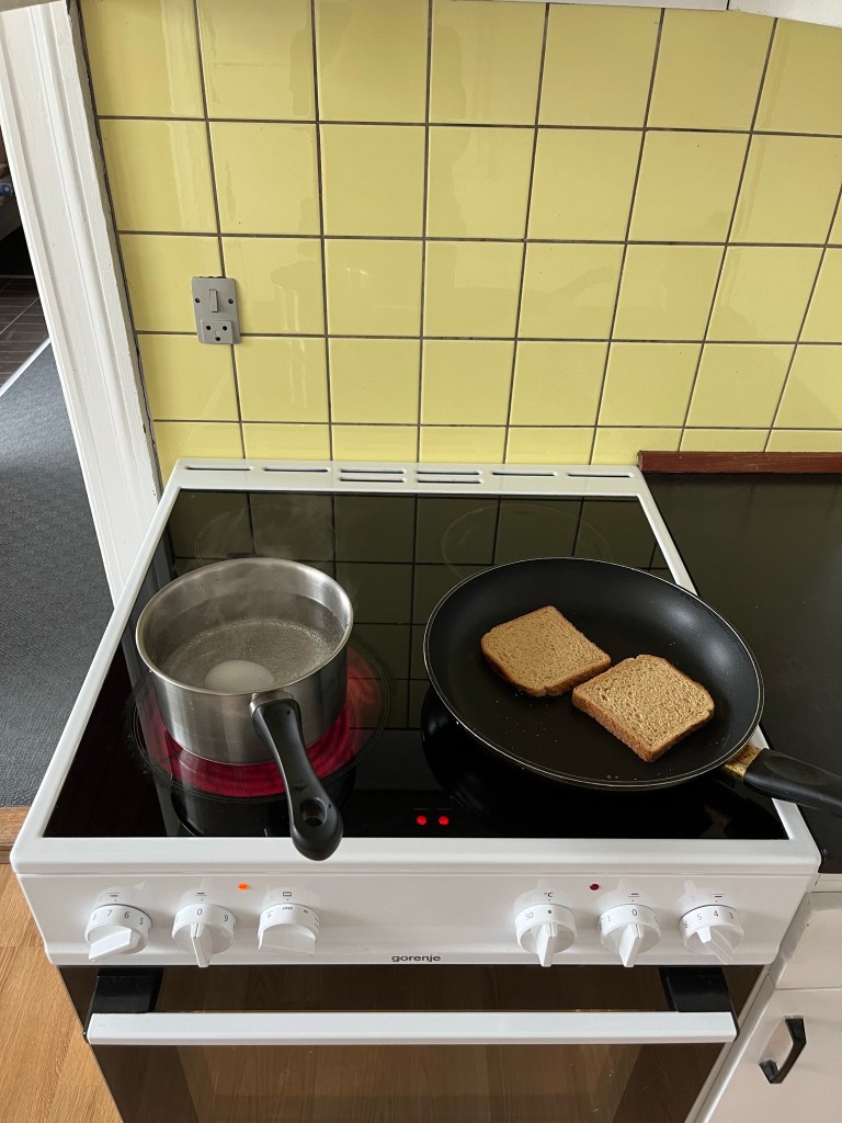 今朝はフライパンでパンを焼き、ゆで卵を茹でた。あと、持ってきたクッキーを砕いてバナナとヨーグルトと合わた。