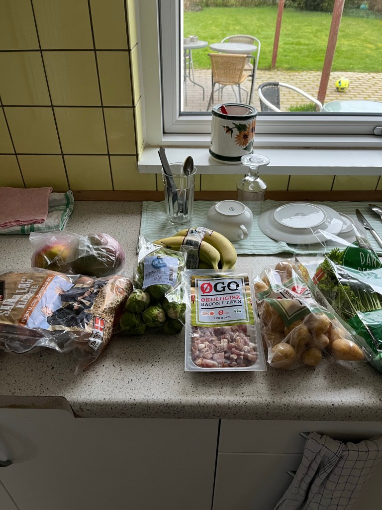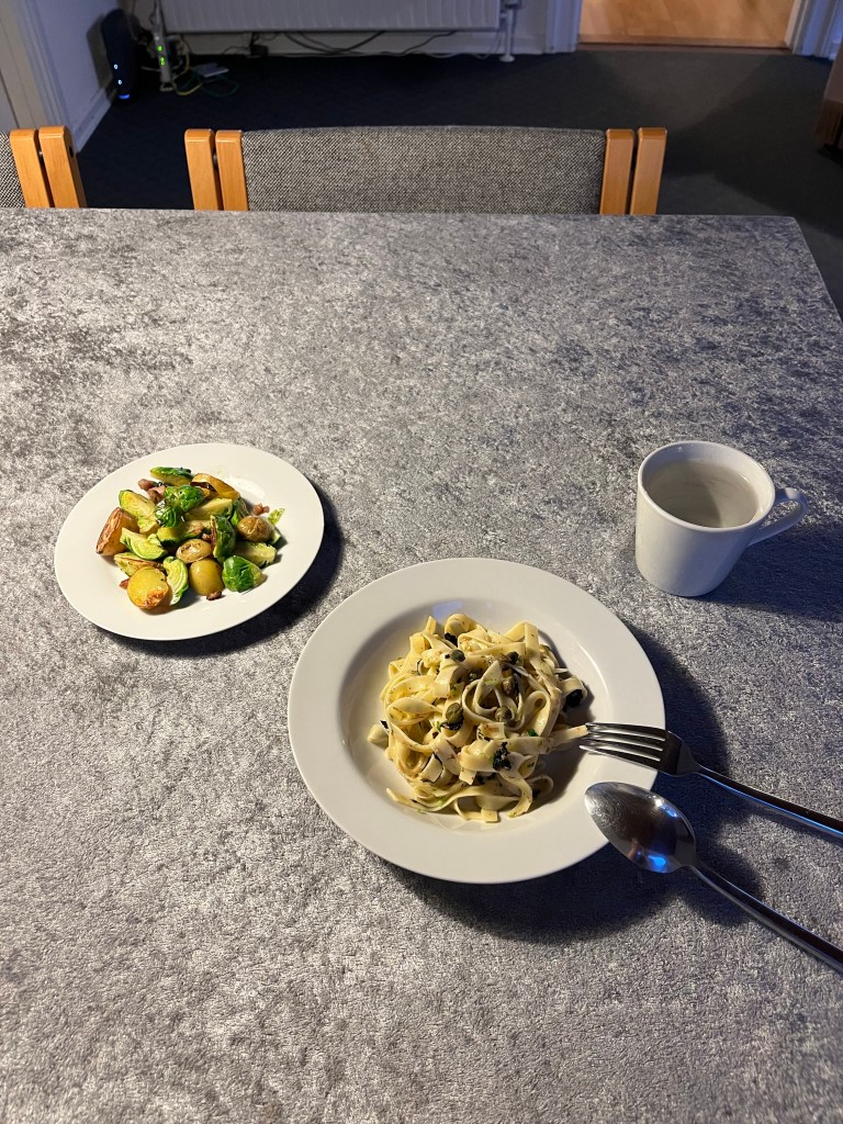 夜は芽キャベツとじゃがいもとベーコンのオイル炒めとケッパーとパセリの和風パスタ